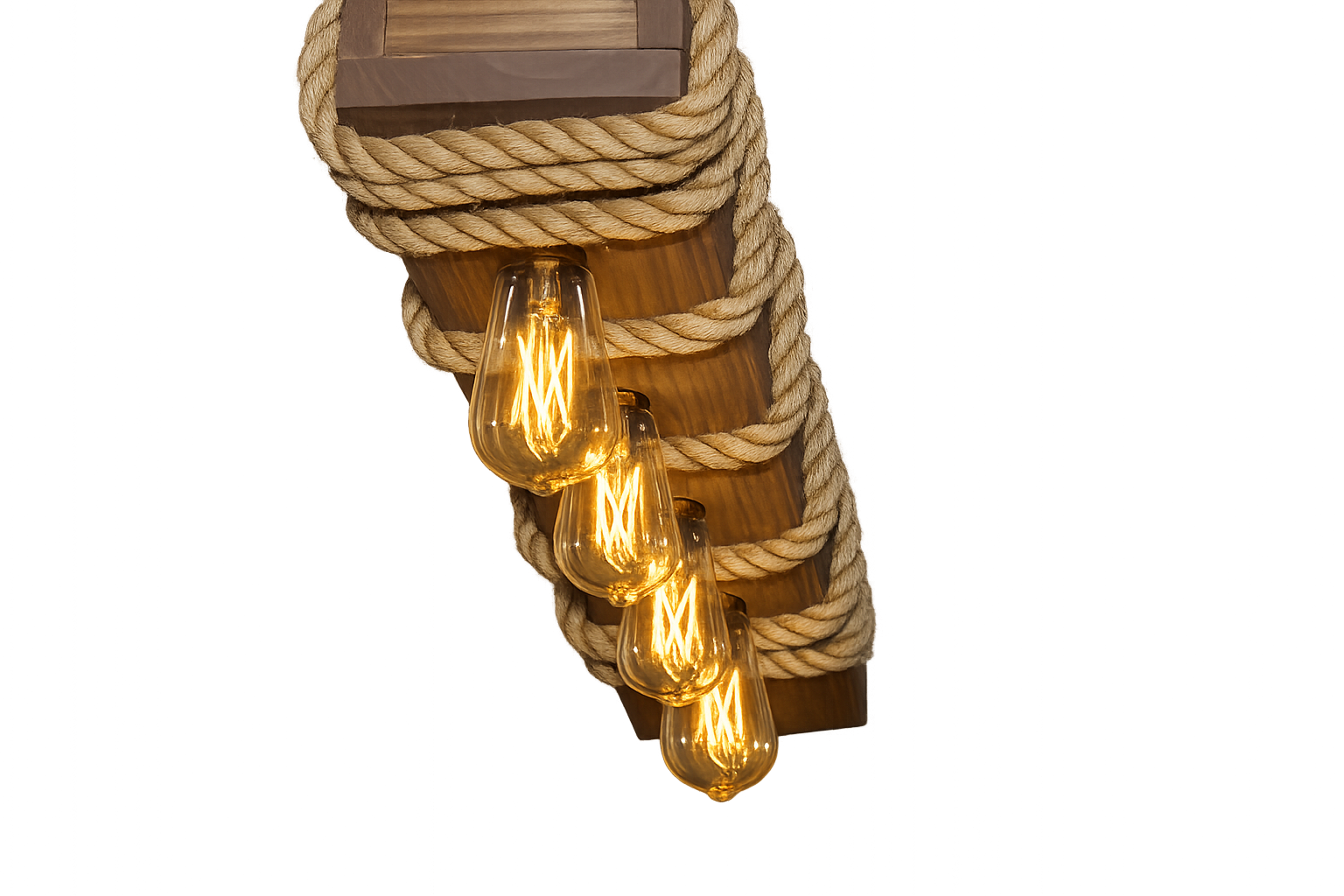 La distribución de sus cuatro focos ofrece una luz uniforme y envolvente. Se recomienda el uso de focos cálidos tipo vintage para resaltar la veta natural de la madera y la textura del yute, generando un ambiente acogedor y elegante.